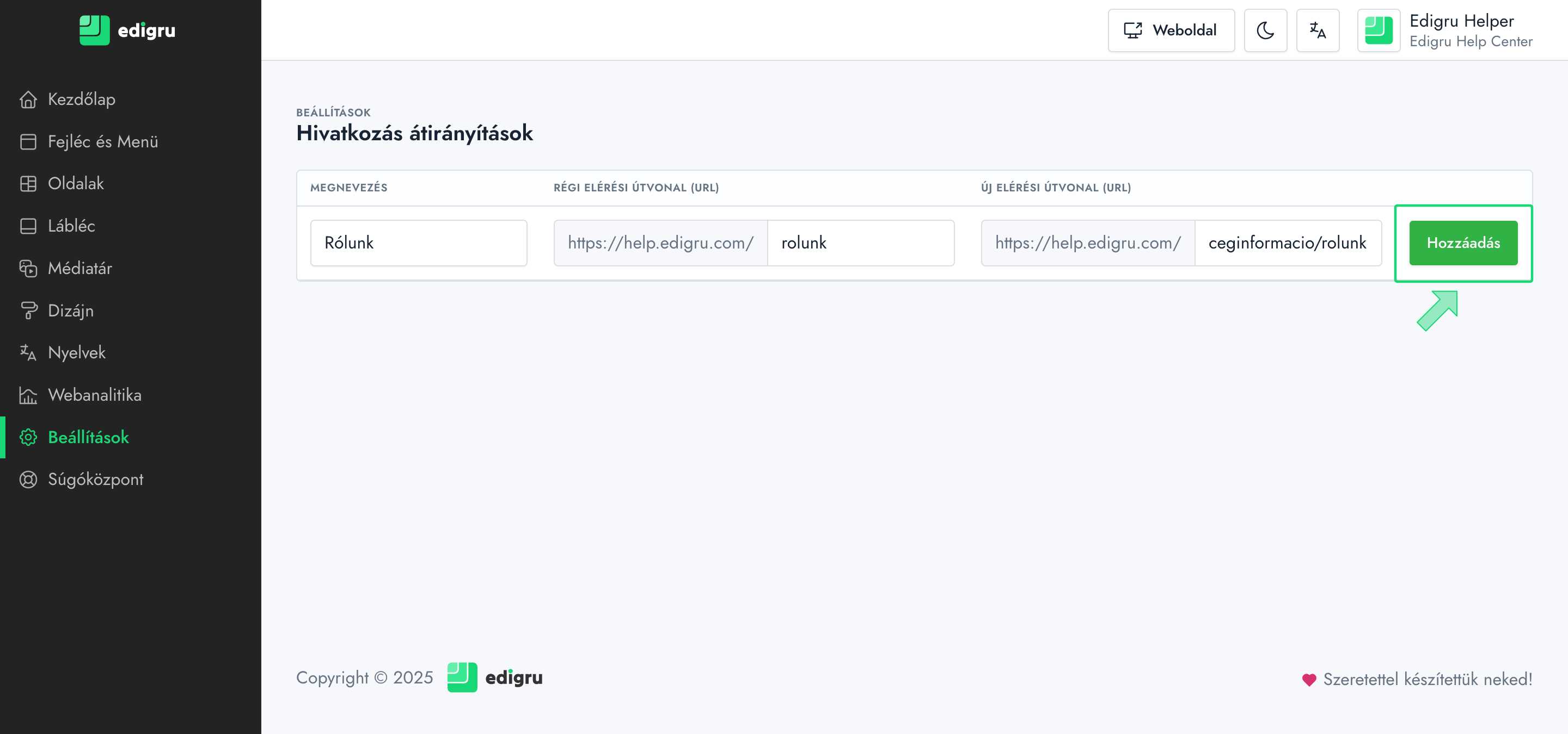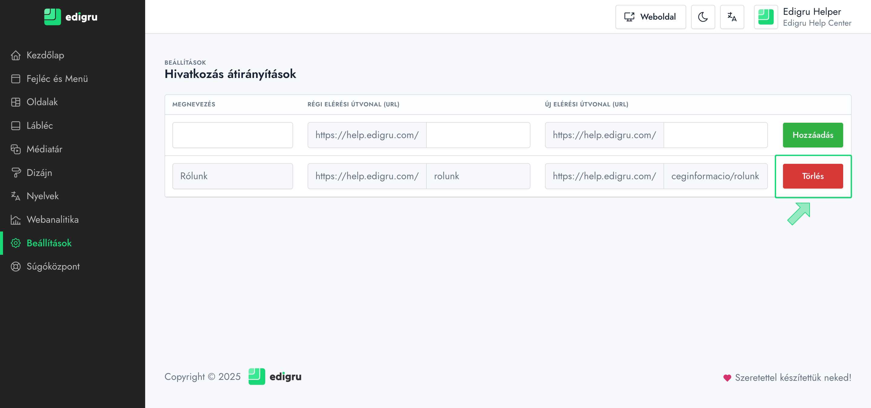 Megjegyzés: Az átirányítások száma nincs korlátozva az edigru rendszerben, ugyanakkor vigyázzunk, hogy már átirányított tartalom tovább irányítását ne külön műveletként vegyük fel az oldalunk átláthatósága és a keresőmotorok általi jó értékelése érdekében! Ilyen esetben javasolt törölni a korábbi átirányítást és az új, legújabb linkre irányítani a régi linket egy teljesen új művelettel.