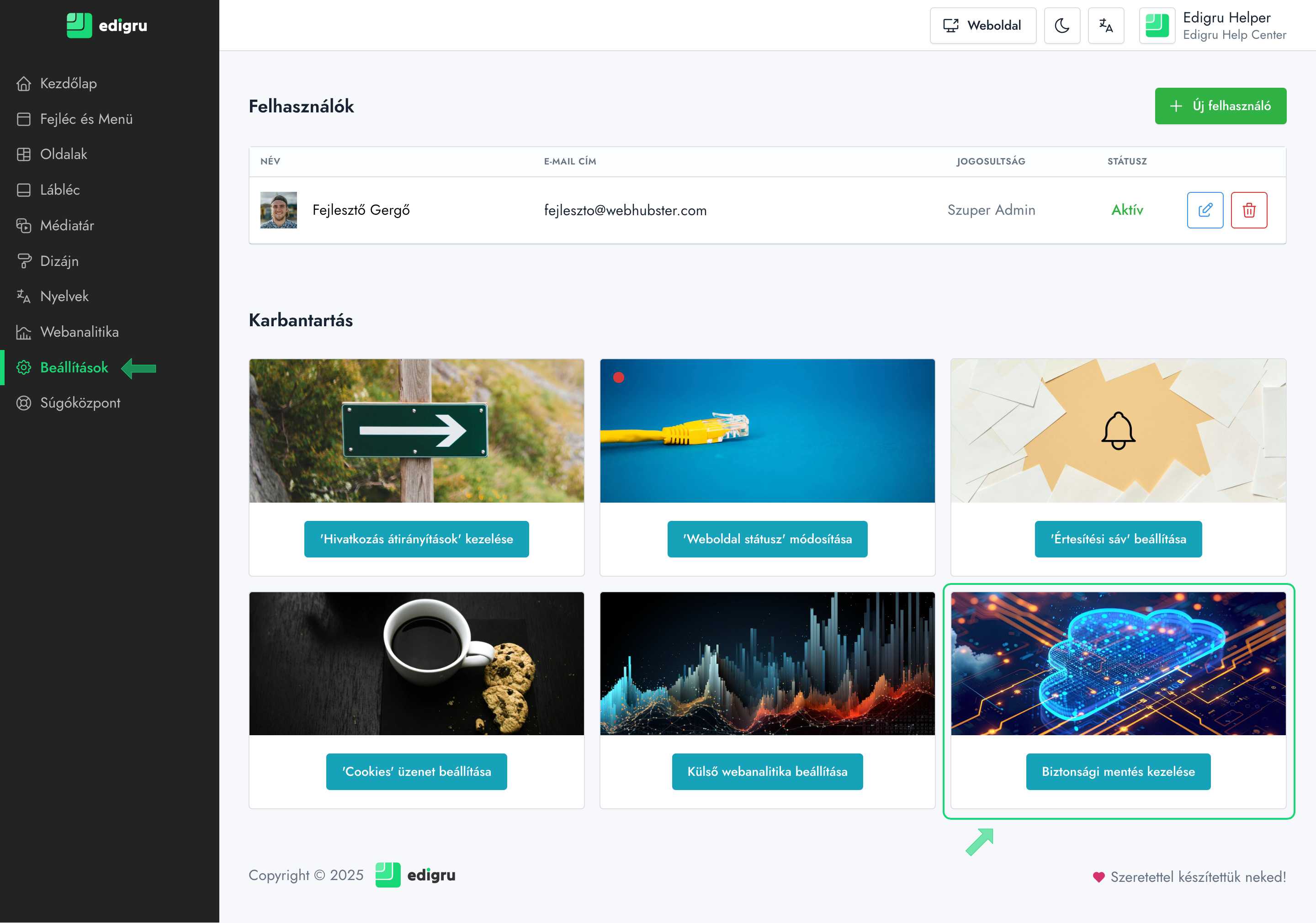 Az edigru rendszer fejlesztői is fontosnak és elengedhetetlennek tartják, hogy az ügyfeleink adatai, oldalai és munkája biztonságban legyen. Ezért tették elérhetővé a biztonsági mentés funkciót, amit a honlap elkészültekor, illetve azután is minden jelentős változtatáskor javasolt elvégezni.