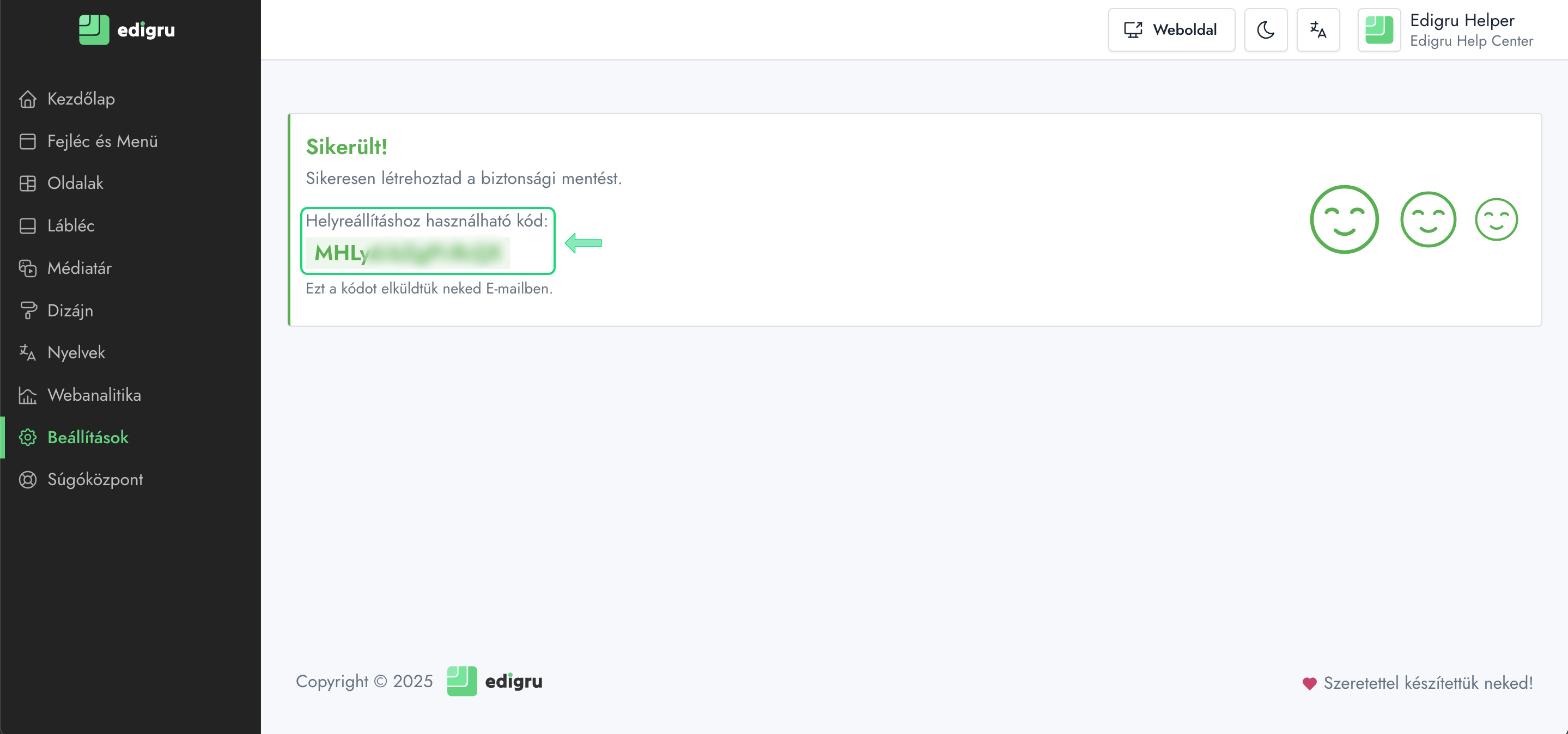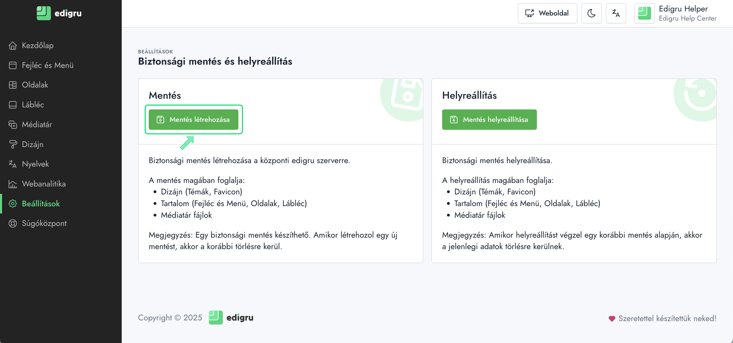 Biztonsági mentés létrehozása a központi edigru szerverre történik. A folyamat eredményeként a weboldal dizájnja (témák, favicon), tartalma (fejléc, menü, oldalak, lábléc) és a médiatár fájljai is mentésre kerülnek.