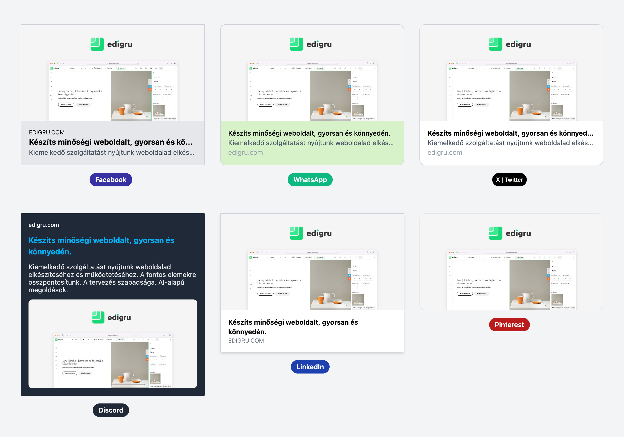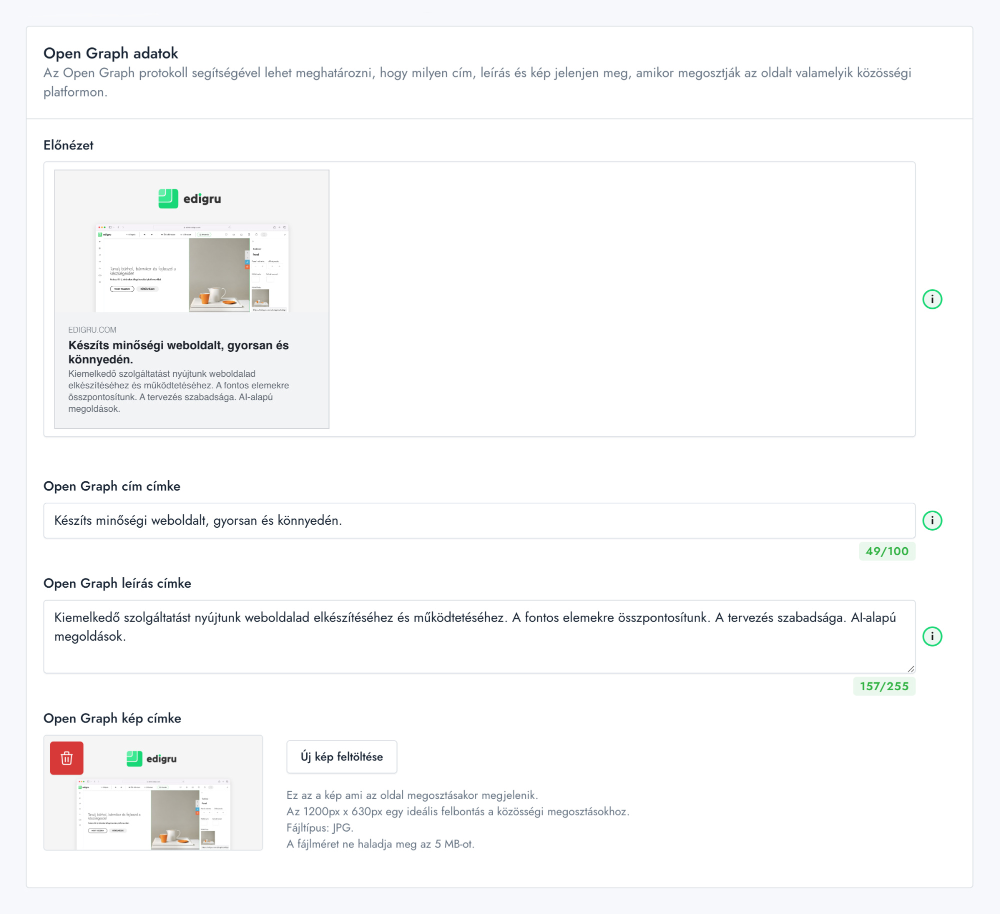 Ajánlott az edigru szerkesztőben erre is figyelmet fordítanunk, ha azt szeretnénk, hogy a honlapunk megosztásakor is igényes, informatív felület/üzenet emelje cégünk megítélését és bevonzza a látogatókat a weboldalunkra.