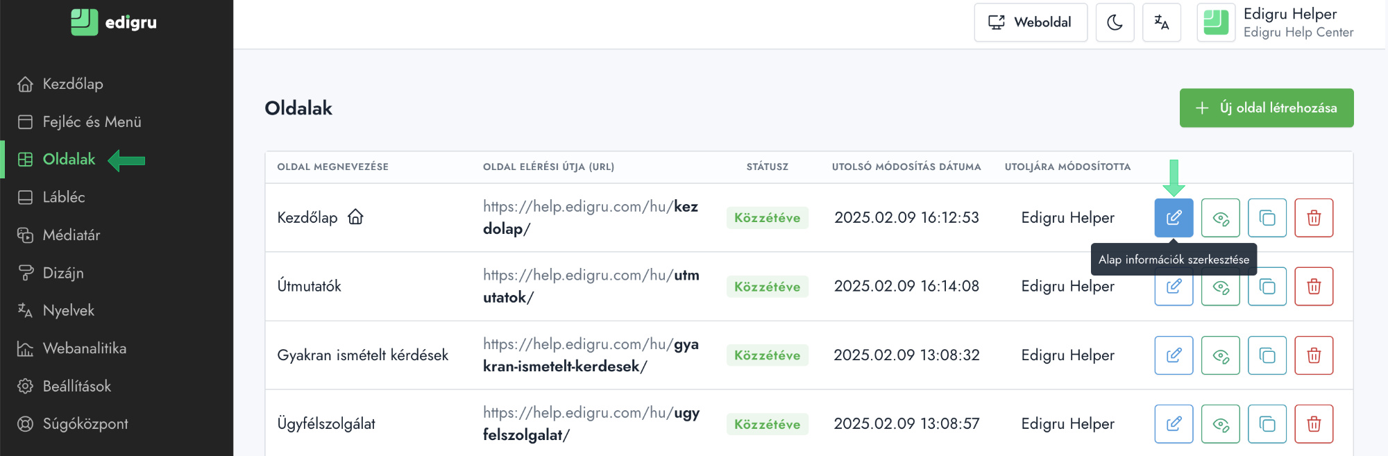 Kattints az "Oldalak" menüpontra az oldalsávban, majd az "Alap információk szerkesztése" gombra annál az oldalnál amit módosítani szeretnél.