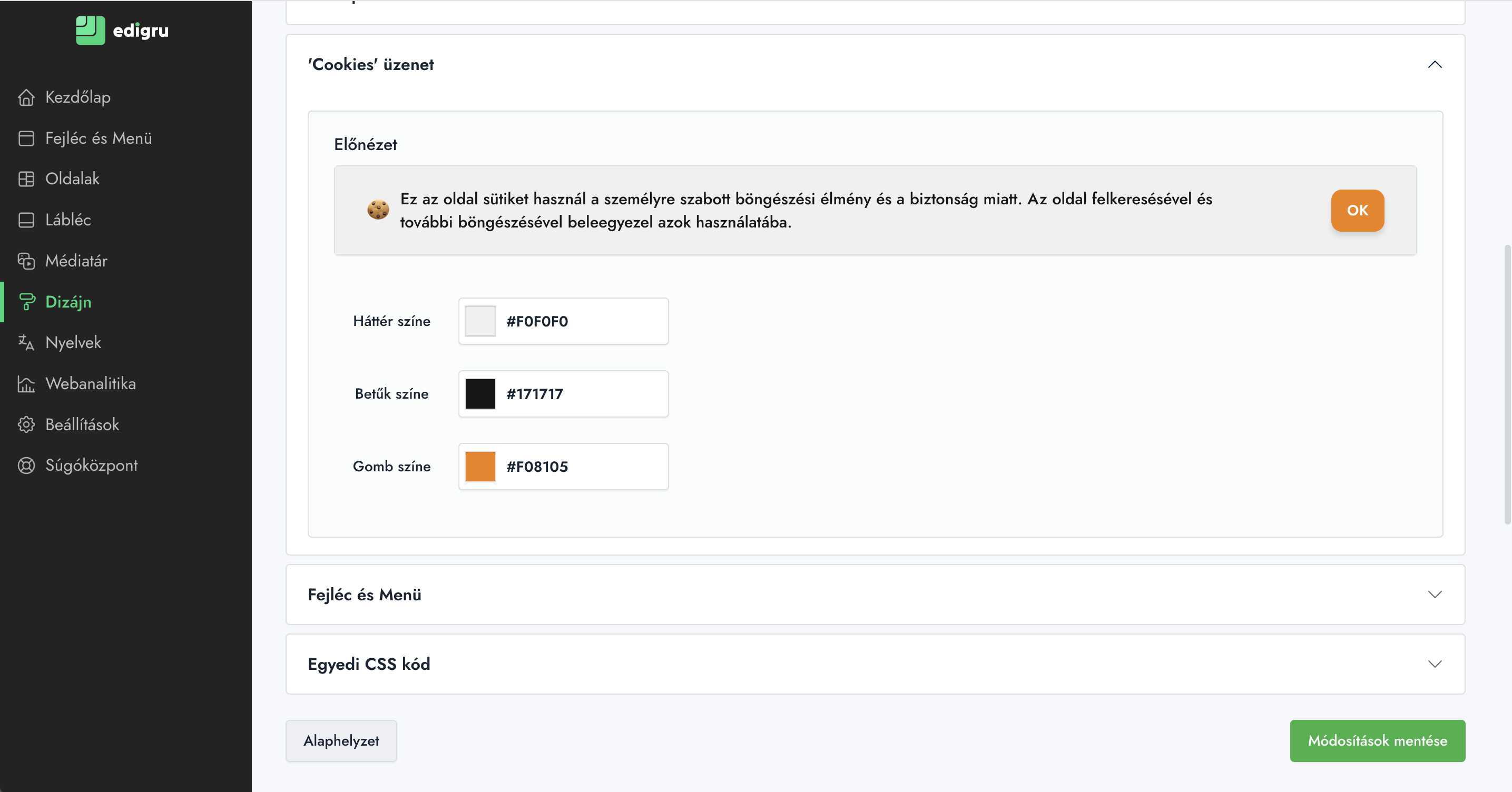 Az edigru rendszerben alapértelmezetten beállításra került egy süti üzenet, amely egyéb szerkesztési teendő szükségessége nélkül is megjelenik a rendszerünkben szerkesztett honlapok látogatóinak, ugyanakkor, mint szinte minden más, ez is testre szabható.