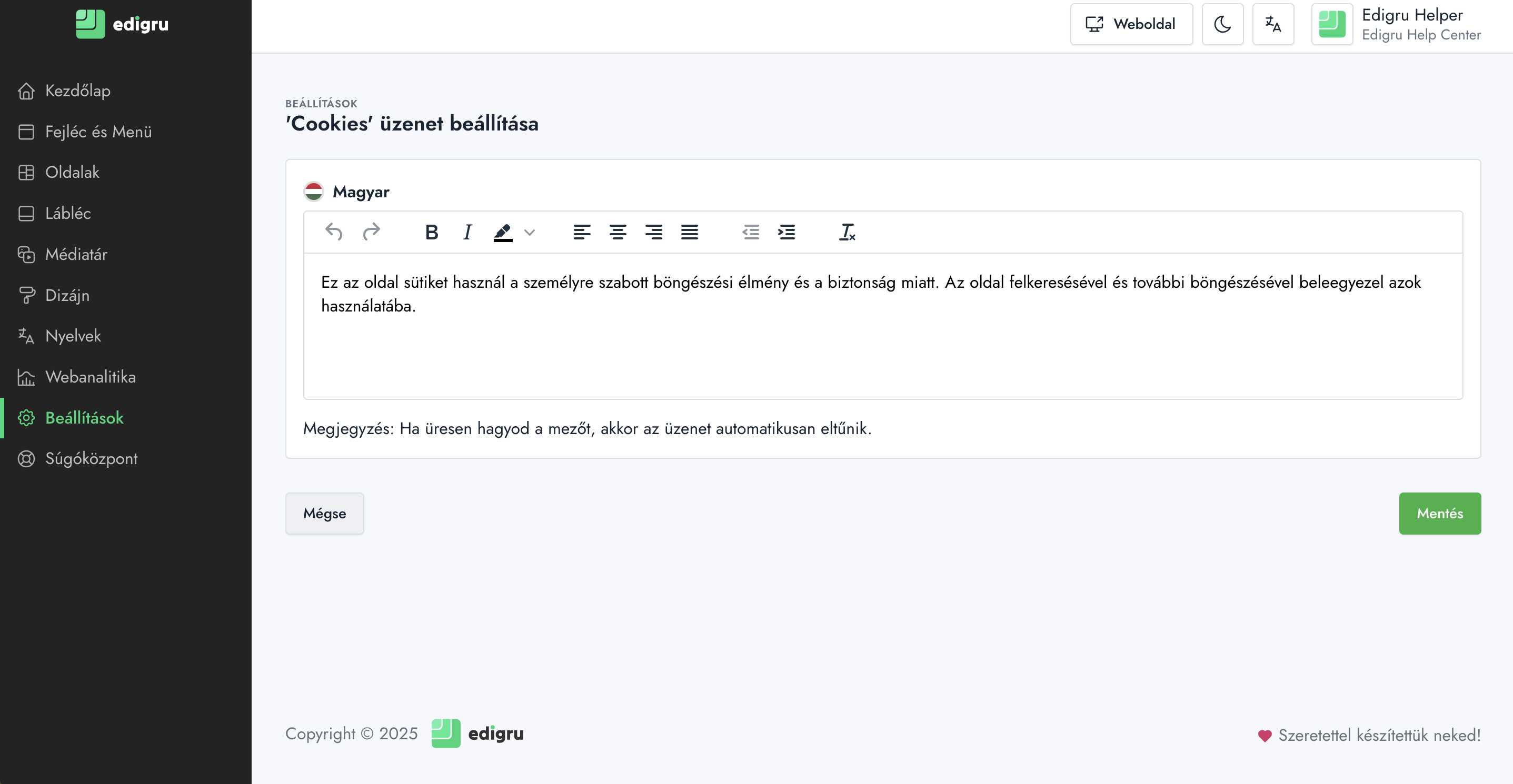 A 'Cookies' üzenet beállítása felületen lehetőséged van megadni az üzenet szövegét, majd a „Mentés” gombbal véglegesítheted a szerkesztésedet.