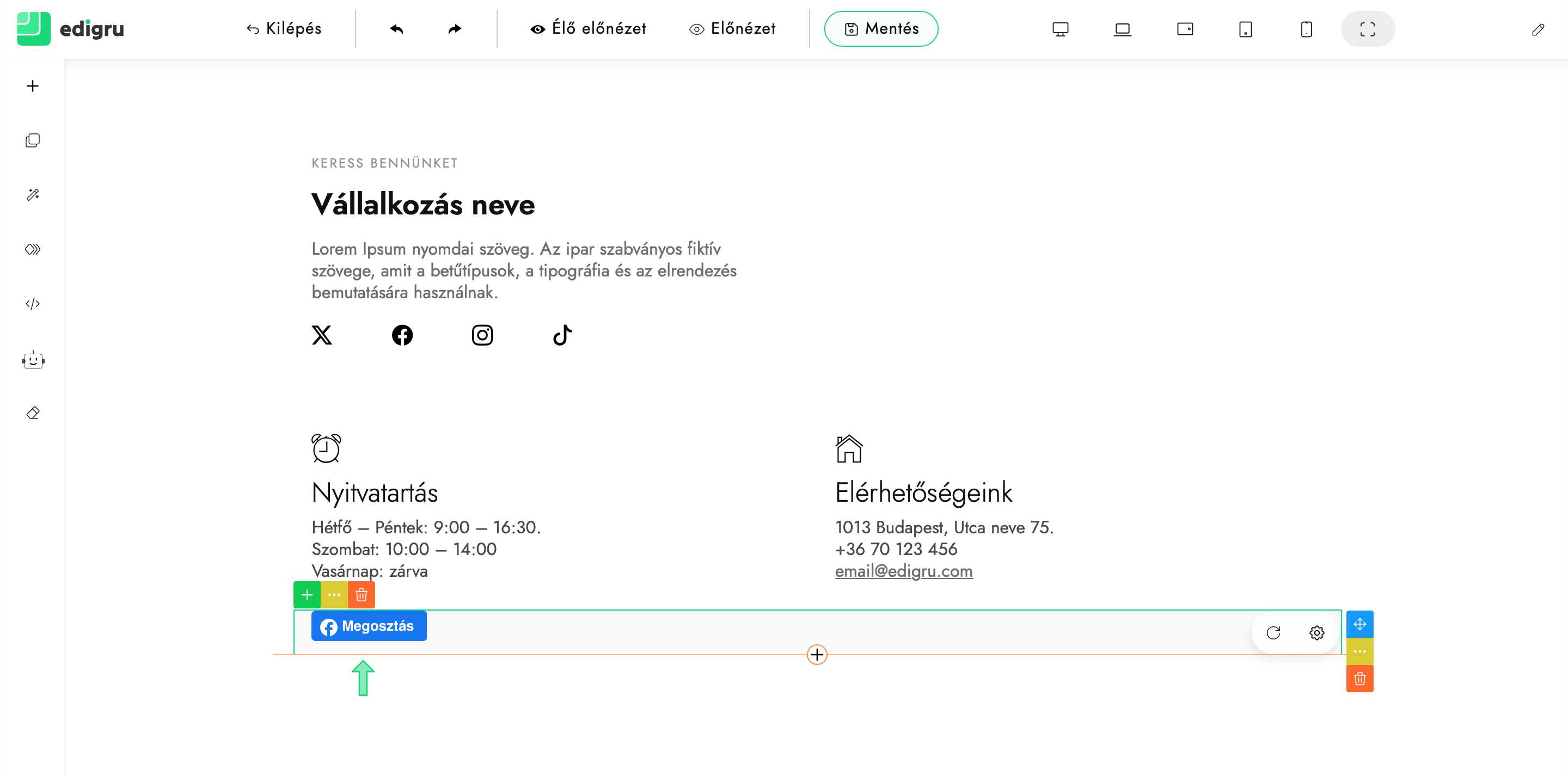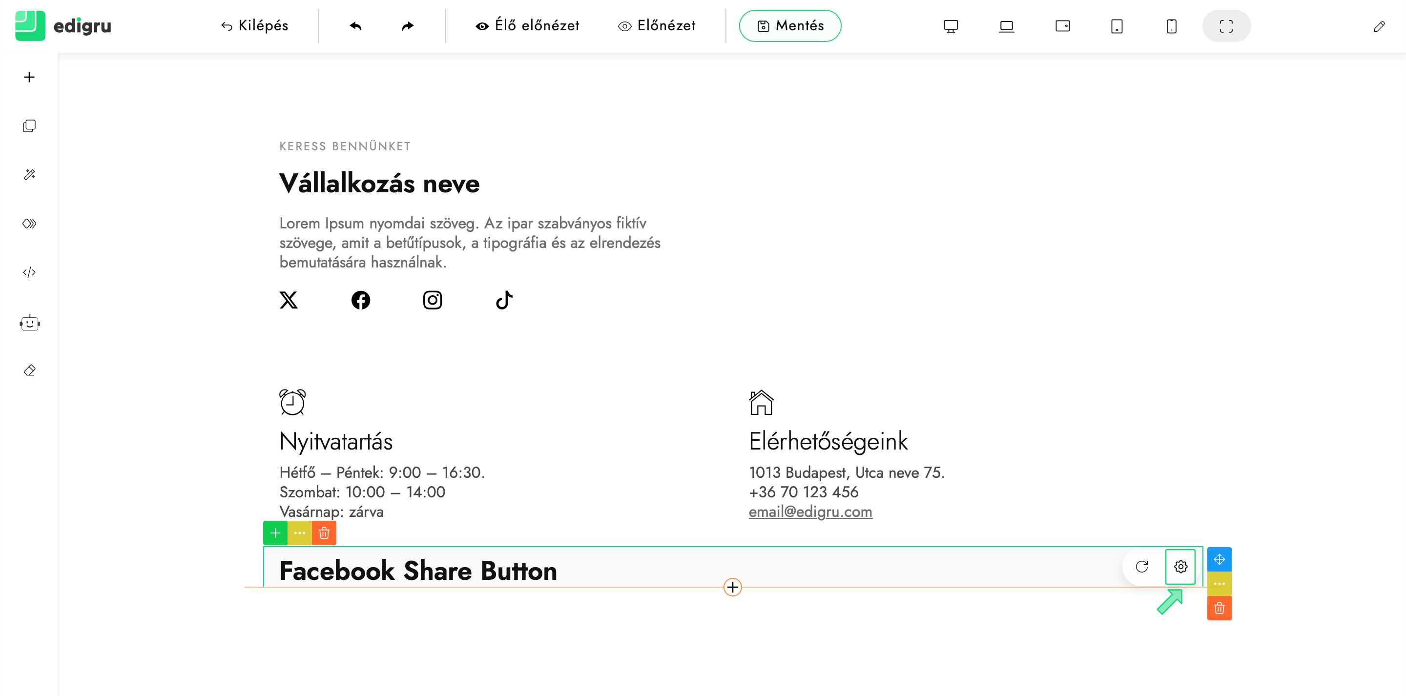 6) Ellenőrizd, hogy megfelelően megjelenik a beillesztett Facebook megosztás gomb. Szükség esetén módosíthatod az elhelyezkedését.