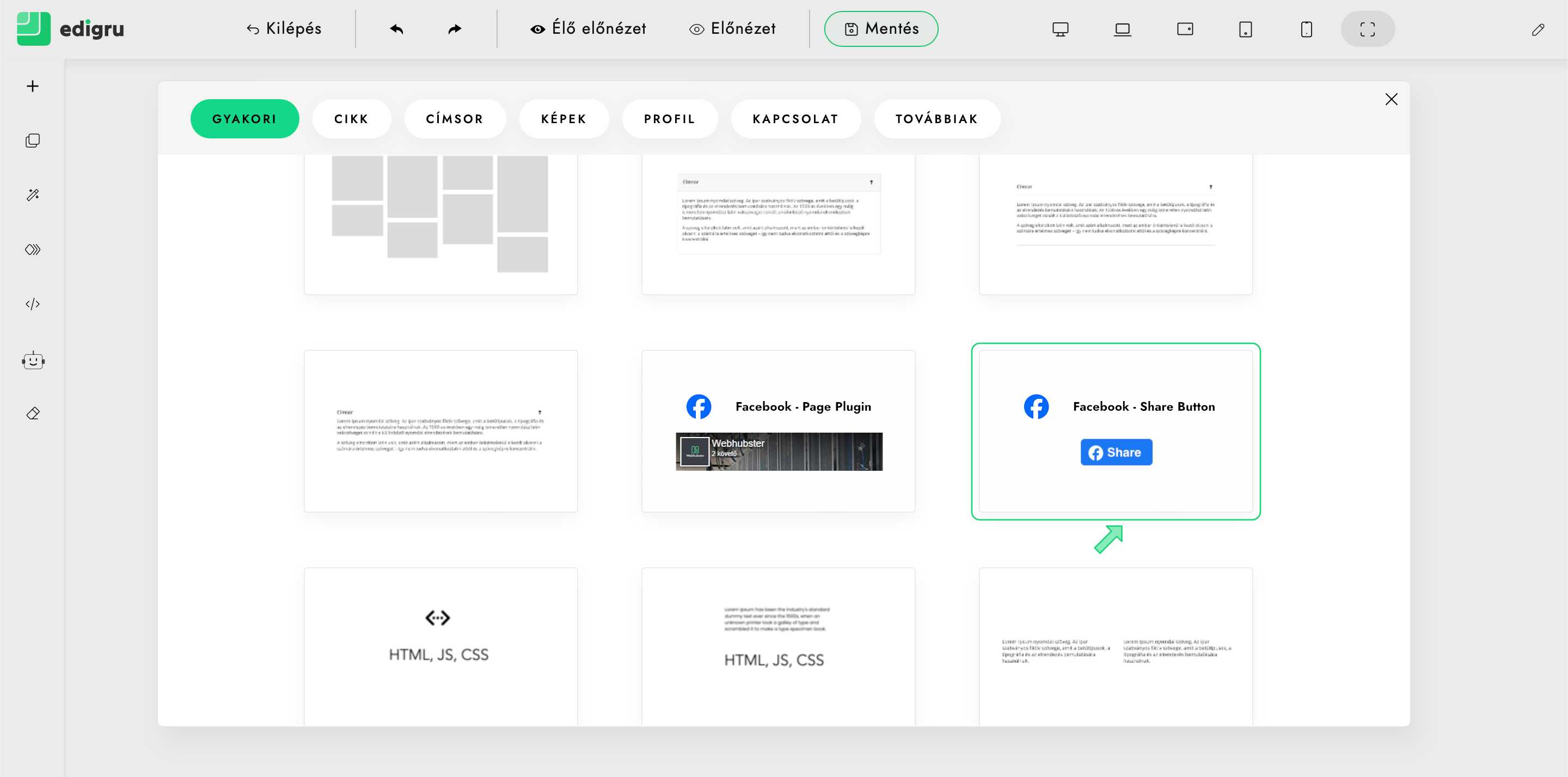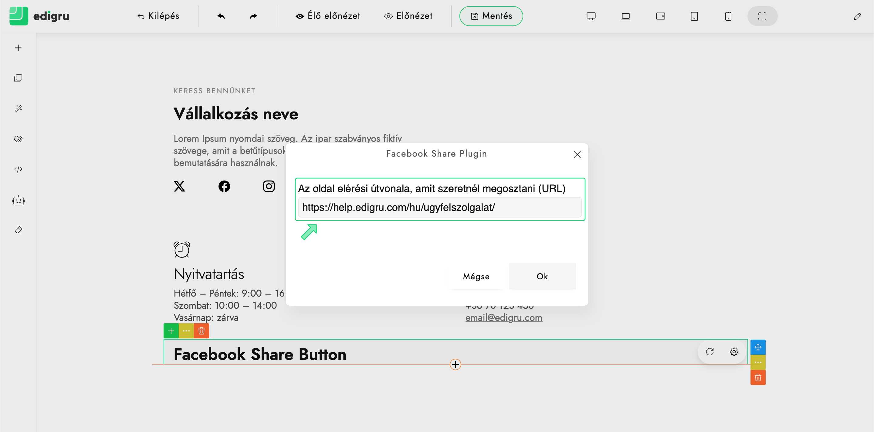 Útmutató arról, hogyan illesszünk be facebook megosztás gombot honlapunkra edigru rendszerben.