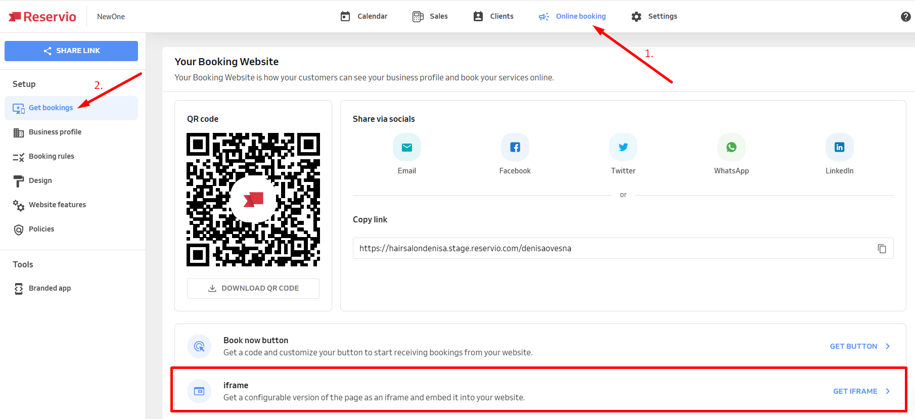 1) Regisztrálj a Reservio oldalán és hozz létre egy foglalási naptárat, majd válaszd ki az "Online foglalás" lapot. Ezután a bal oldali menüben kattints a "Beállítások - Foglalások beszerzése" menüpontra.