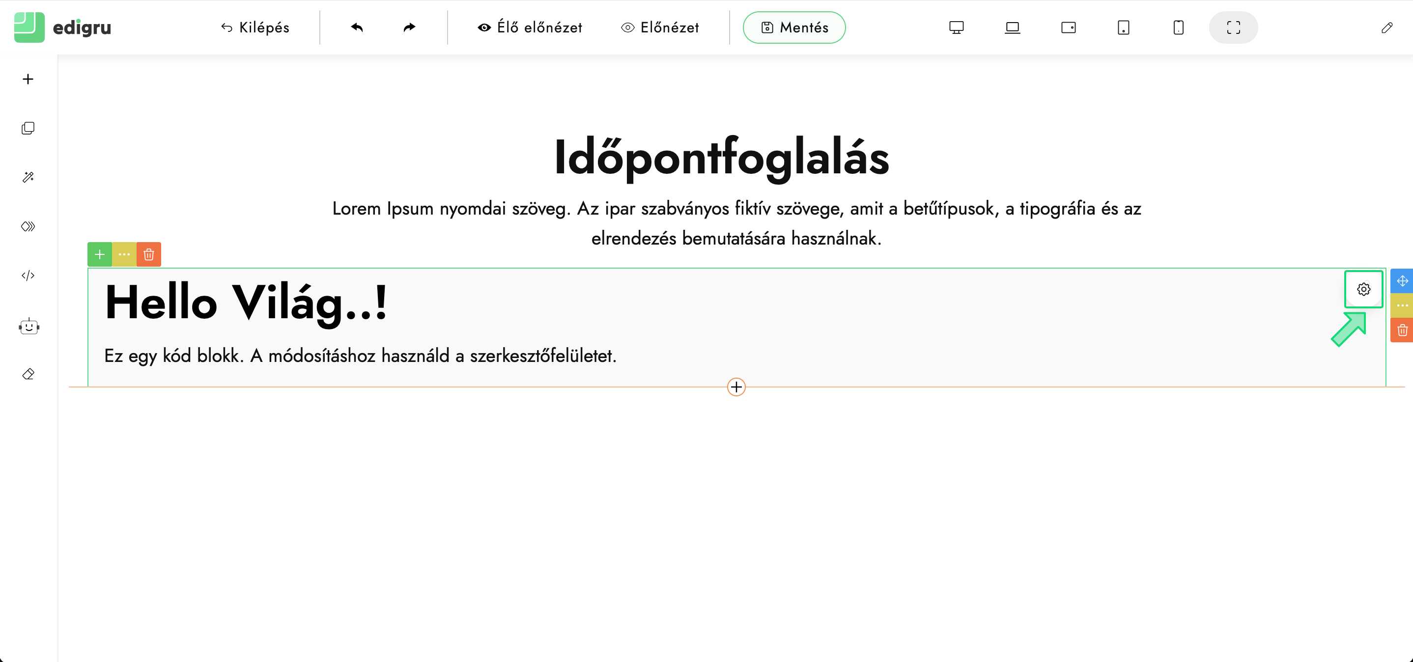 8) A beillesztett blokk kiválasztása után megjelenik a beállítások gomb („Fogaskerék” ikon). Kattints rá.