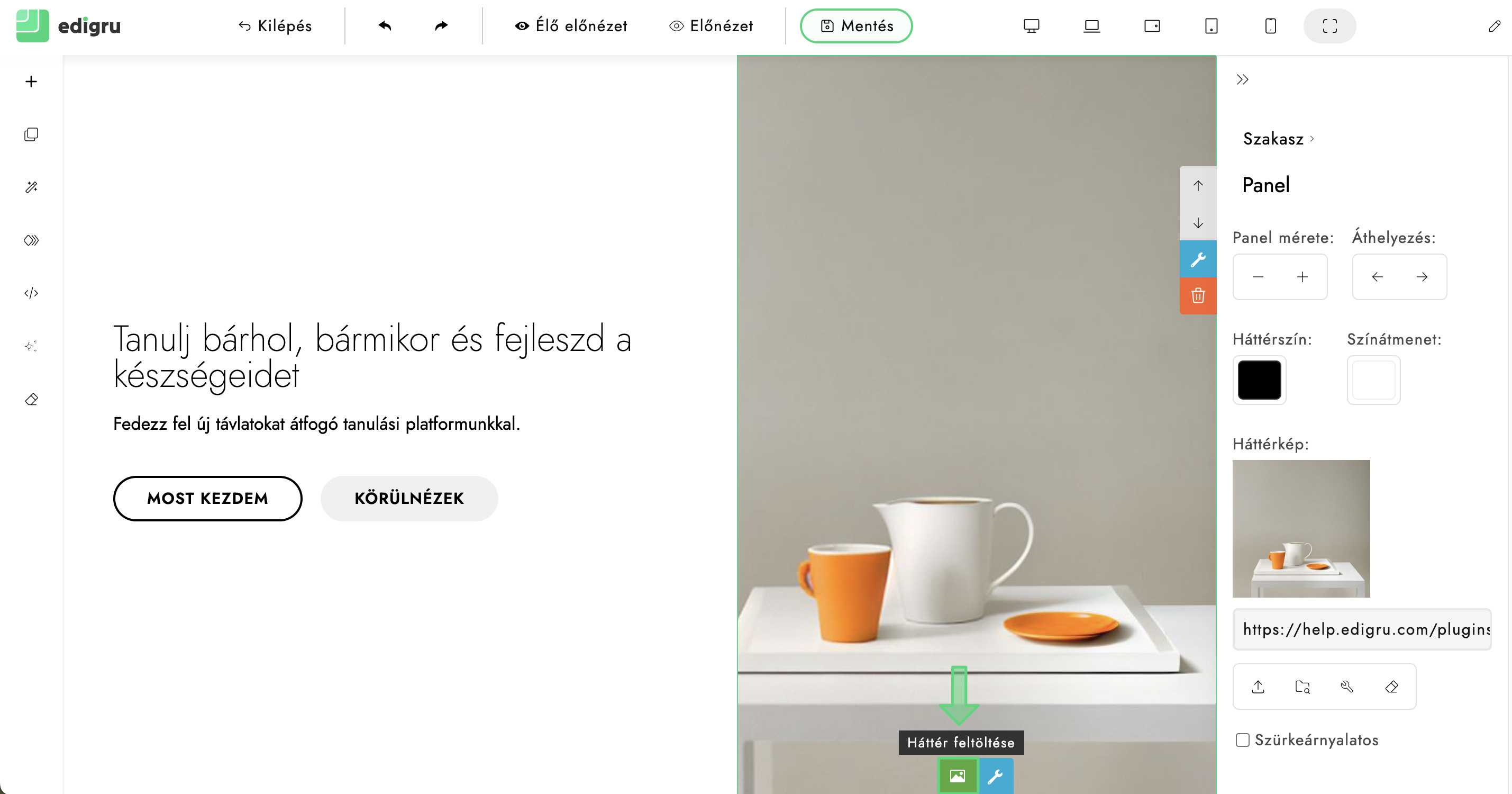 Edigru rendszeren bármely szakaszhoz adhatunk háttérképet a kijelölt szakasz alján megjelenő kép ikonra kattintva. A felugró ablak segítségével rögtön feltölthetünk egyet a saját eszközünkön tárolt képek közül.