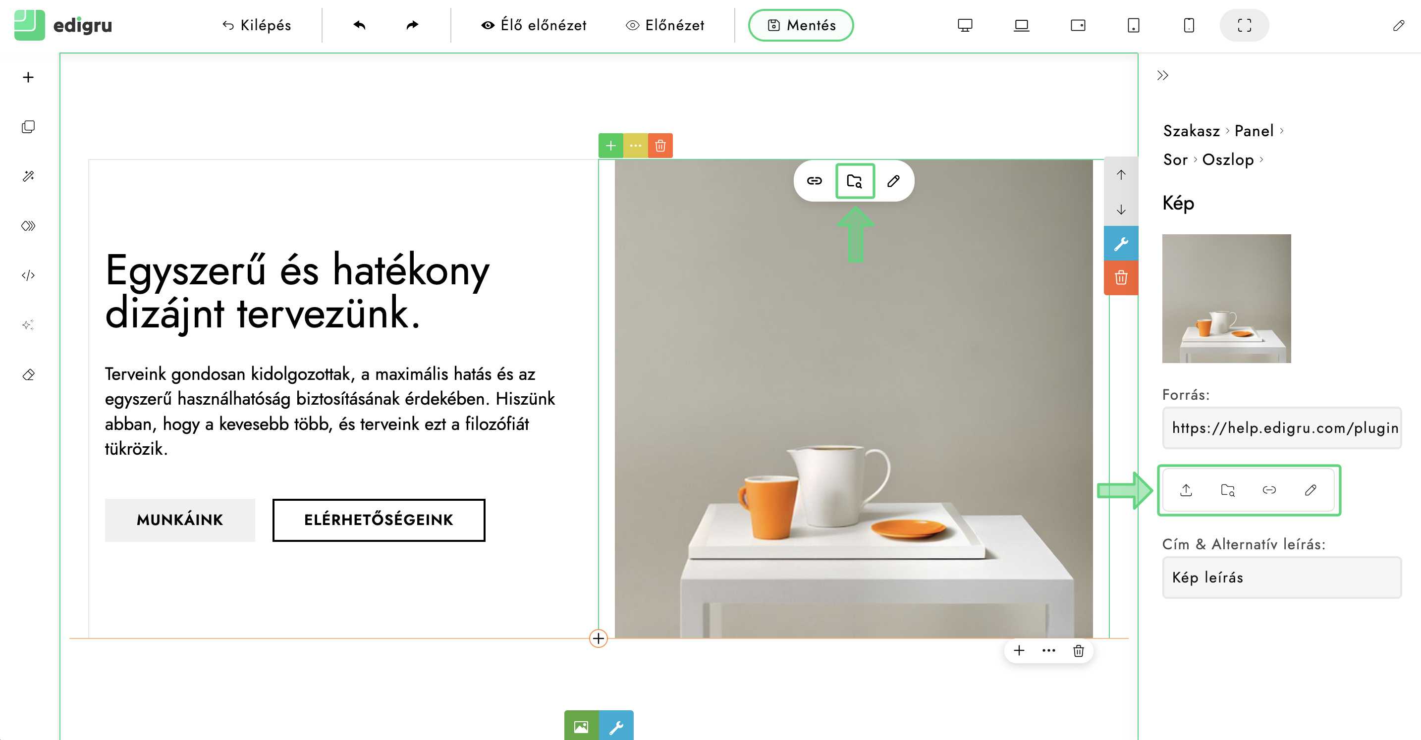 Másfelől számos szakasz tartalmaz képeket. Ezeket a képre kattintva tudjuk módosítani a "Médiatár" ikonra kattintva, vagy a jobb oldalon megjelenő szerkesztősávban.