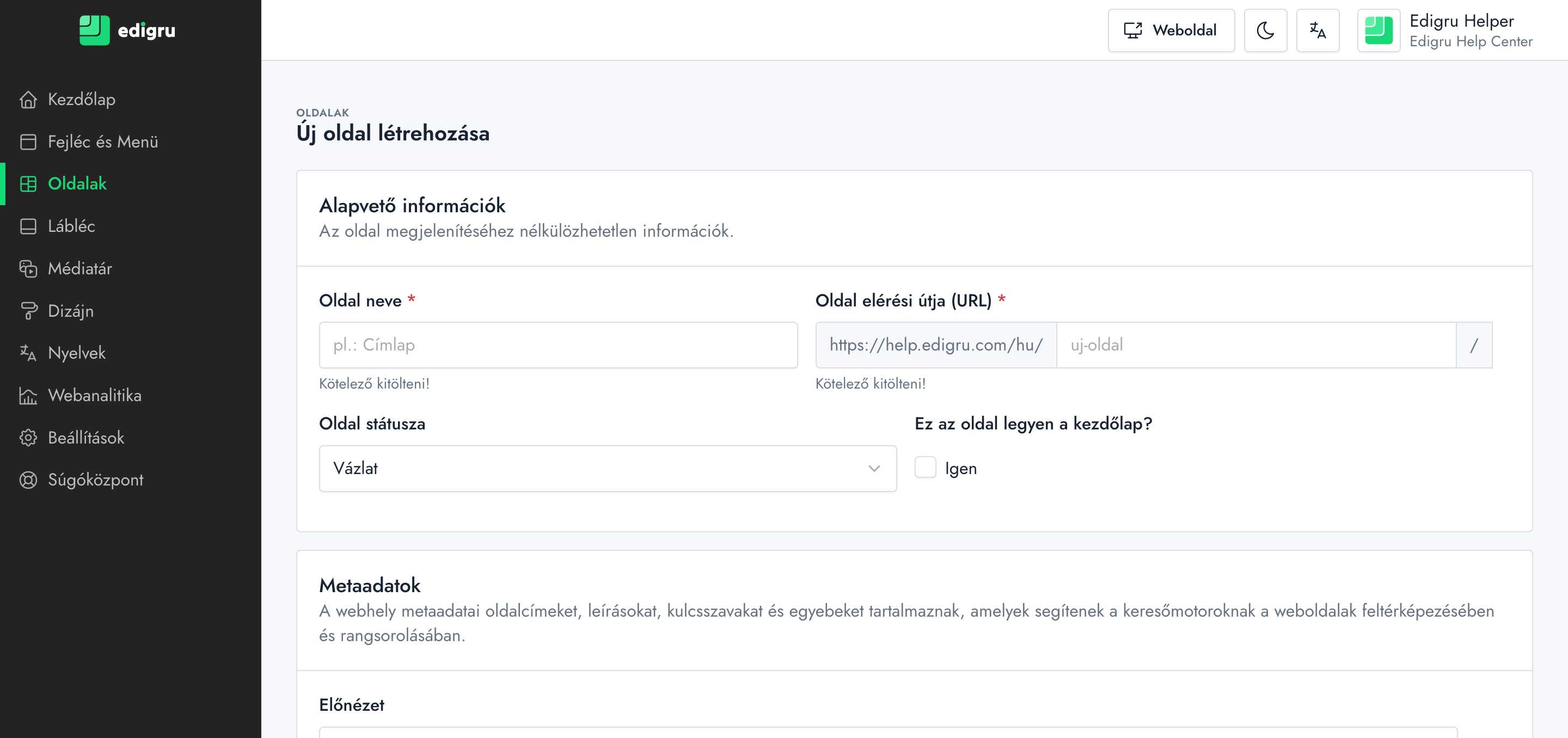 Az „Új oldal létrehozása” című oldalon sorban haladva töltsd ki a mezőket!