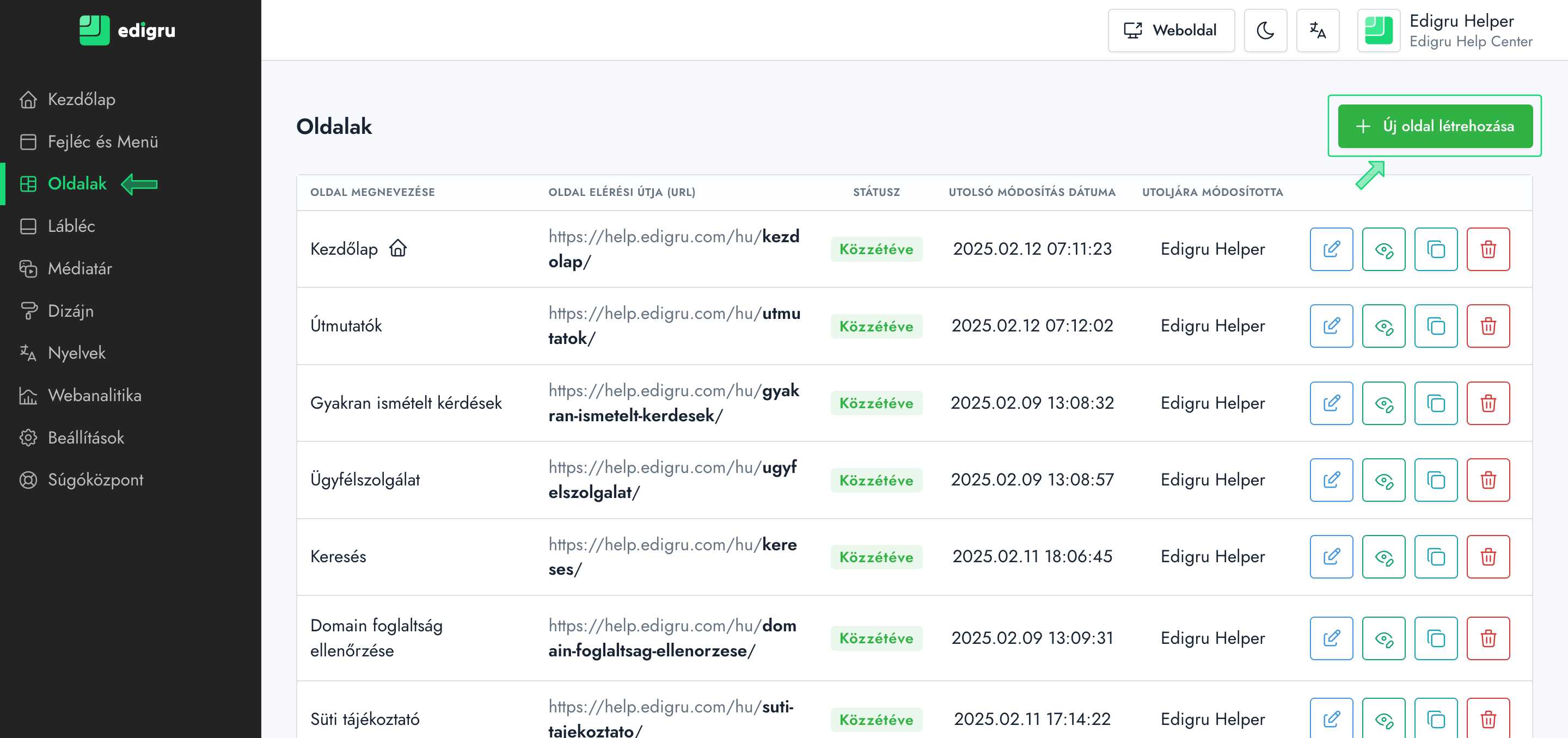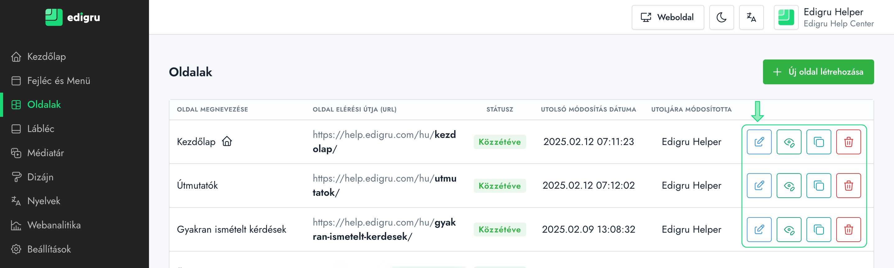 A kész oldalak felsorolásában az adott oldalra vonatkozó főbb információk utáni négy ikonnal balról jobbra haladva tudod a továbbiakban